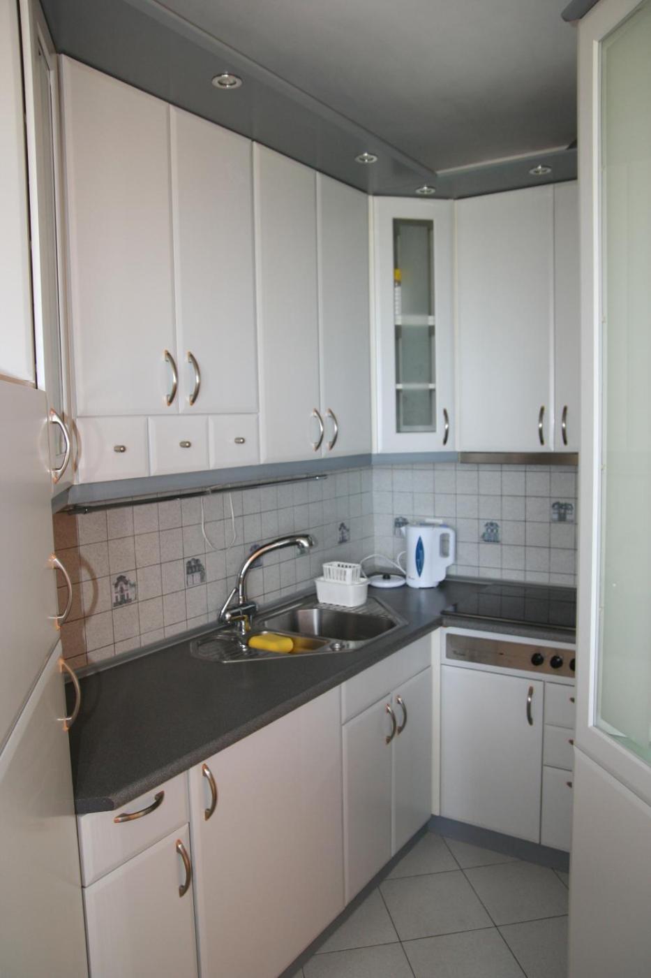 Oferta apartamentu obejmuje sypialnię (1), kuchnię z pełnym wyposażeniem oraz balkon z widokiem na morze.