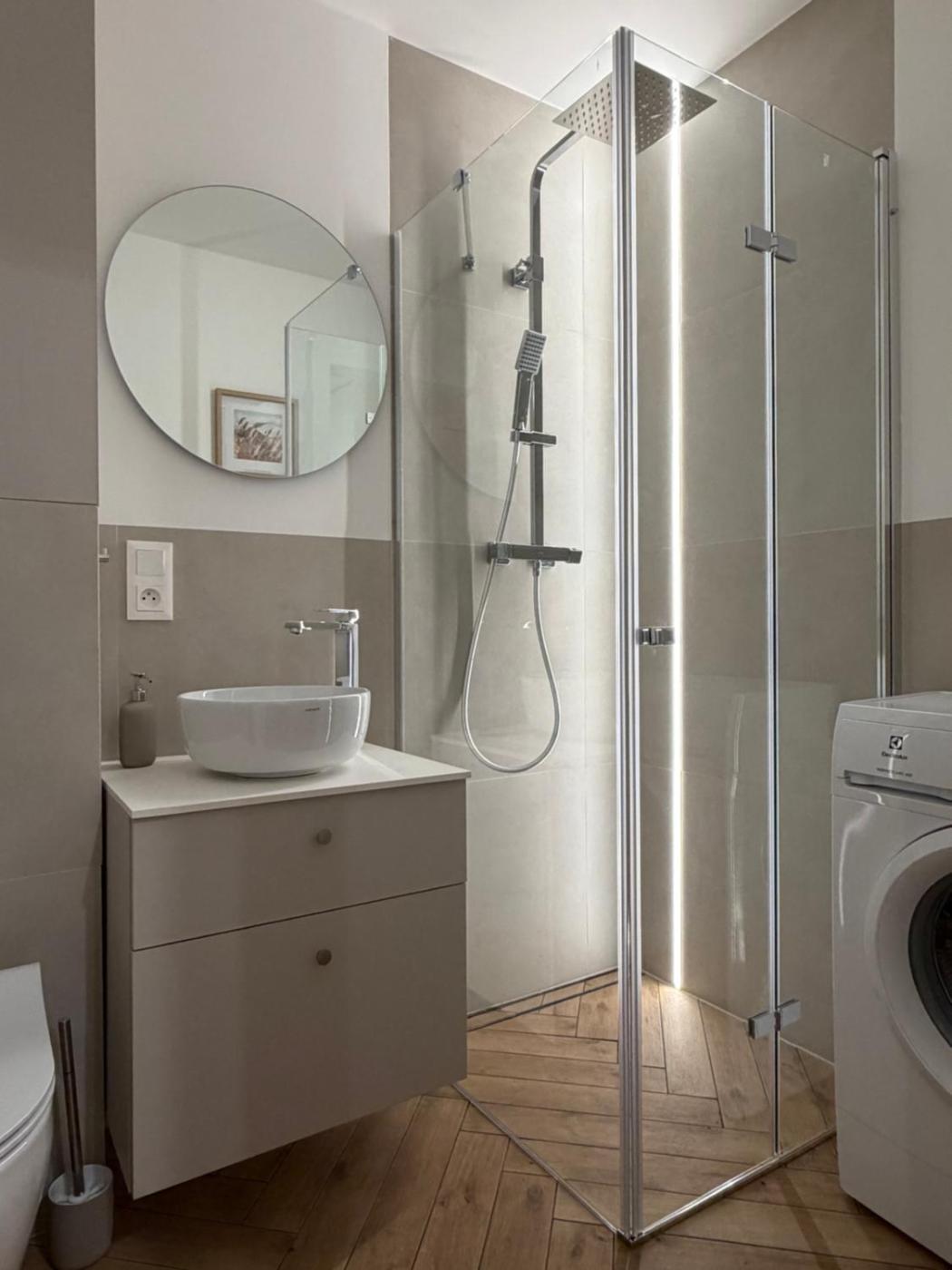 Studio. The studio offers a wardrobe, a sofa, as well as a private bathroom featuring a shower and a hairdryer. Guests can make meals in the kitchen that comes with a stovetop, a refrigerator, a dishwasher and kitchenware. The studio provides a flat-screen TV with streaming services, a washing machine, a tea and coffee maker, a dining area as well as garden views. The unit offers 1 bed and 1 futon. Studio - 3 osobowy. Powierzchnia pokoju ok.: 28 mkw.