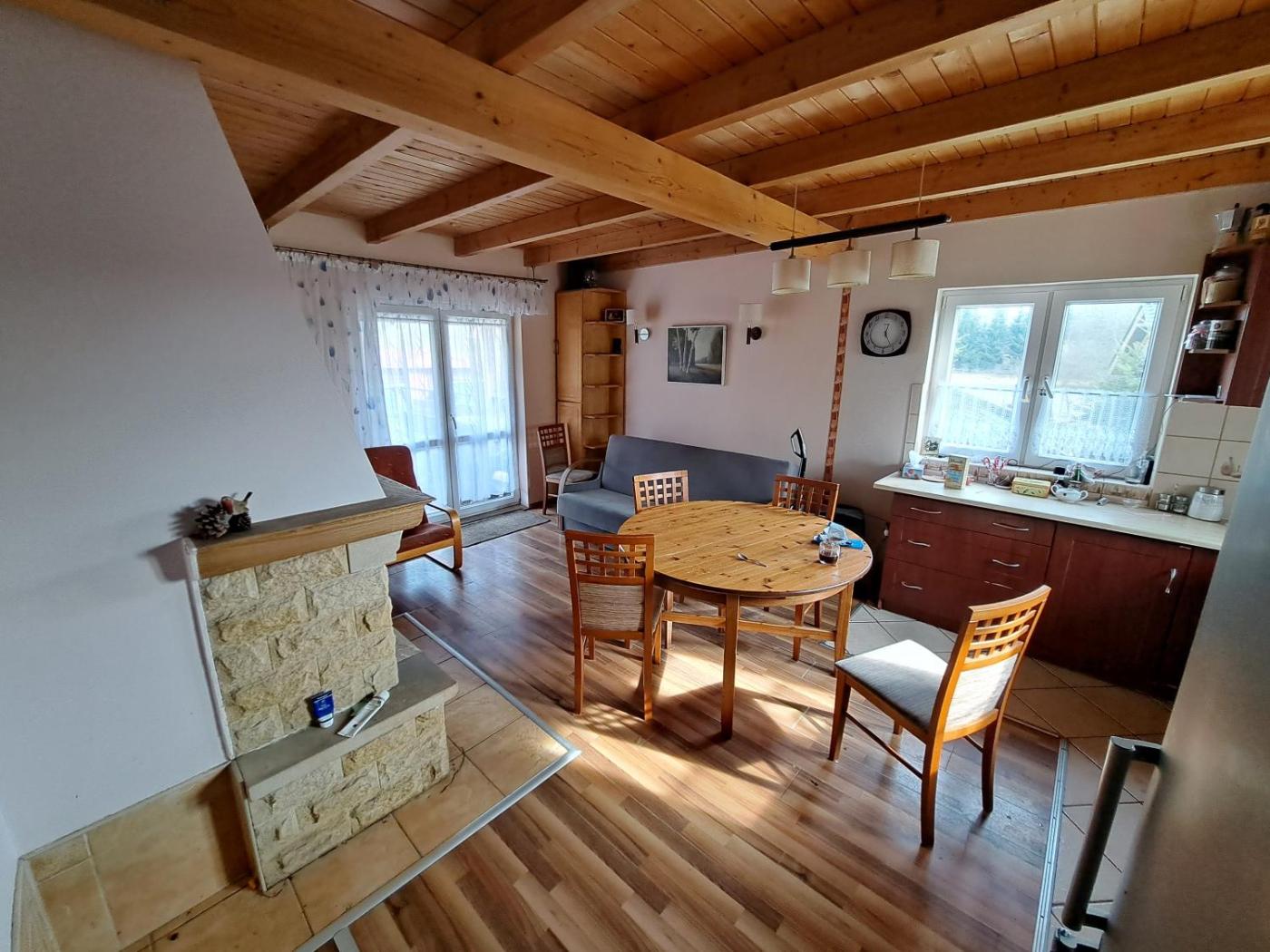 Dom z 2 sypialniami. This holiday homes special feature is the fireplace. Guests will find a stovetop, a refrigerator, a dishwasher and kitchenware in the well-equipped kitchen. The holiday home also offers a barbecue. Featuring a terrace with garden views, this holiday home also provides a washing machine and a flat-screen TV with streaming services. The unit offers 4 beds. Dom wakacyjny - 6 osobowy. Powierzchnia pokoju ok.: 86 mkw.